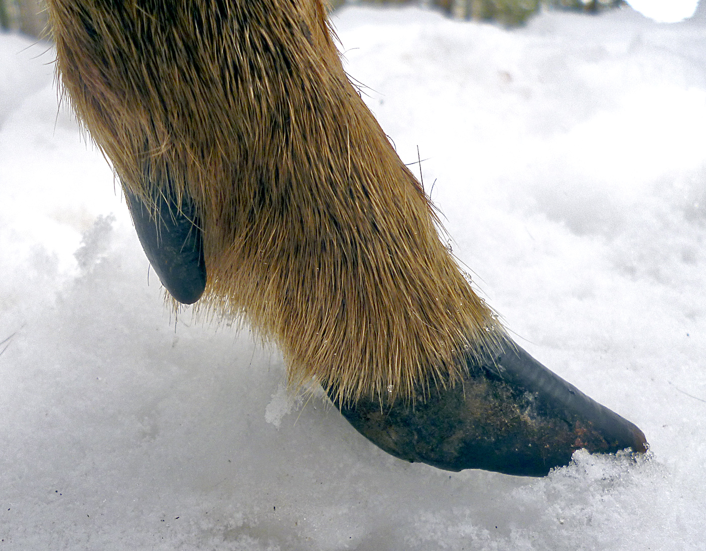 4. En las patas delanteras puede llegar a marcar las guardas si el sustrato es el adecuado, siempre y cuando la huella se marque con la suficiente profundidad. En este caso, las guardas quedarían a unos 2,5 cm del borde interior de las pezuñas, y alineadas con las mismas.